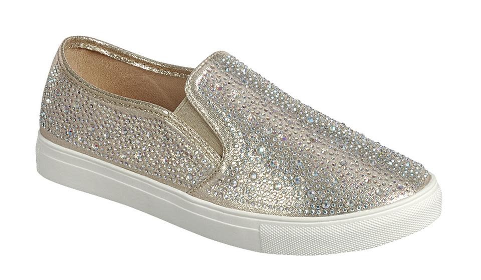 Shimmering rhinestones lend a fab finishing touch on these cozy slip-on sneakers that boast a versatile solid hue for match-ready coordination with every glittering glance.