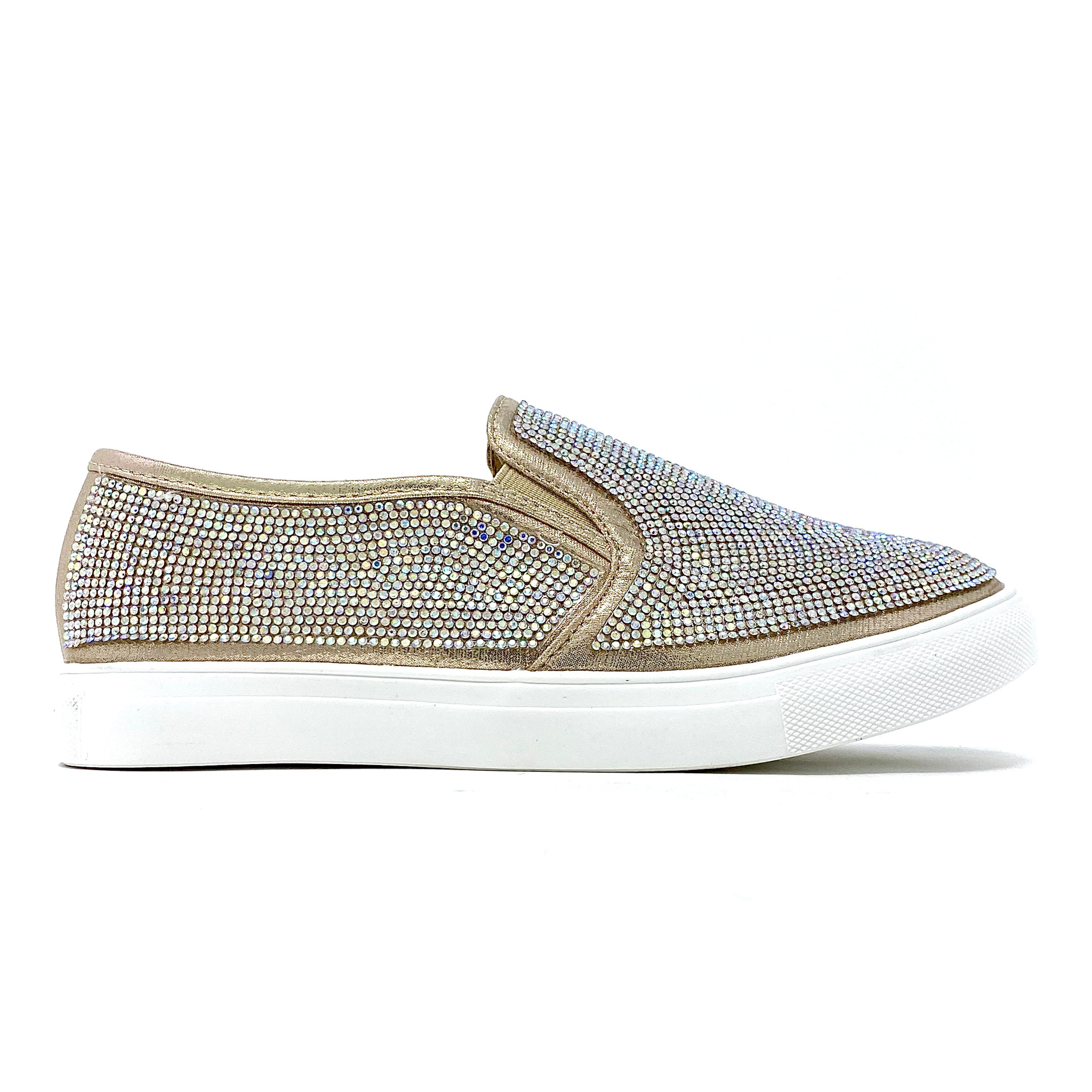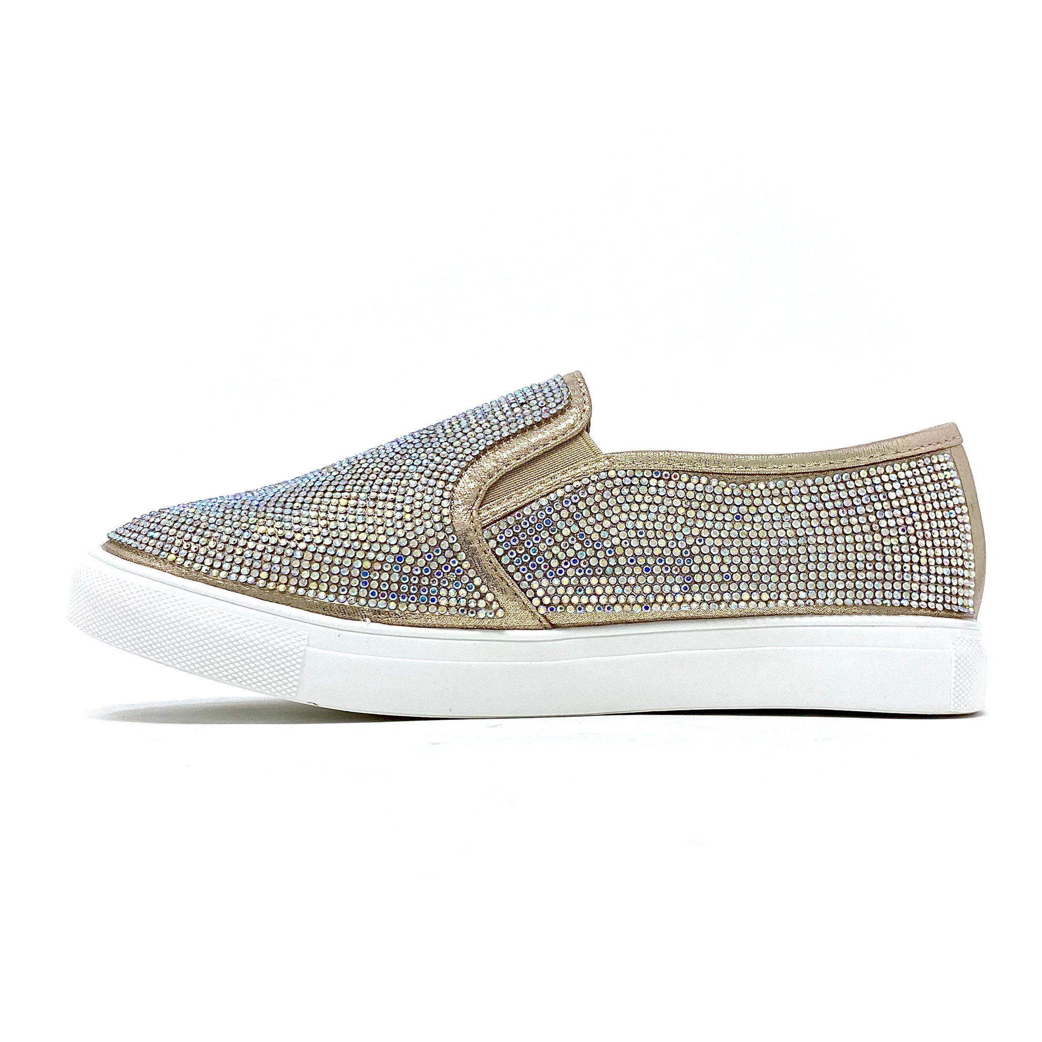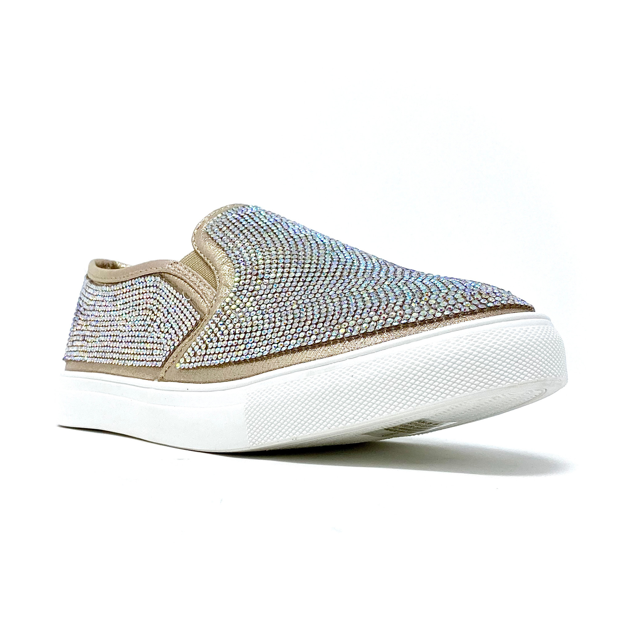 Shimmering rhinestones lend a fab finishing touch on these cozy slip-on sneakers that boast a versatile solid hue for match-ready coordination with every glittering glance.